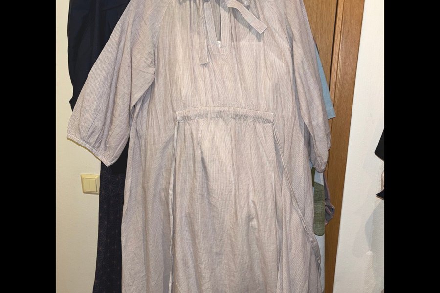 Skir, randig klänning med knytband i halsen och i midjan. Klänningen har trekvartsärm och en ledig passform samt tillhörande bomullsunderklänning
