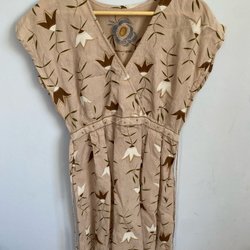 Vit klänning med ett blommigt mönster i rosa och lila nyanser. Klänningen har en rund halsringning, 3/4 ärmar och en volang nedtill. Stängs med en liten knapp baktill.