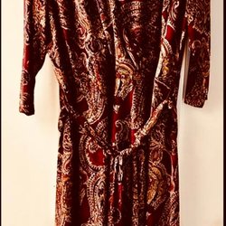 Vinröd klänning med ett vackert paisley-mönster i olika färger. Klänningen har trekvartsärmar och en rund halsringning. Material tunn blank satängliknande. Knälång.