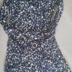 Blå klänning med svart, blå blommönster, omlottmodell och knytband i midjan. Mycket fin!