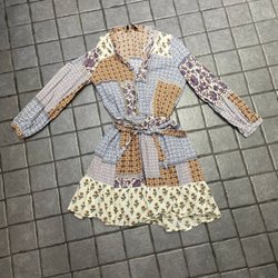 Denne kjole har et farverigt mønster med blomsterlignende motiver i nuancer af brun, orange, grå og sort. Kjolen har lange ærmer og en elastisk talje, der skaber en flatterende silhuet. Halsudskæringen er rund med en lille åbning bagpå, der lukkes med en knap. Kjolen falder løst fra taljen og ned.