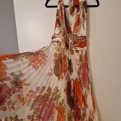 Klänningen har en V-ringning, breda axelband och dragkedja i sidan.
