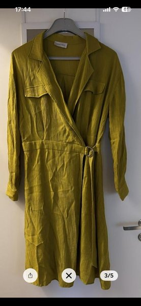 Vacker olivgrön/gulgrön omlottklänning med bälte, glansigt material, vadlång.