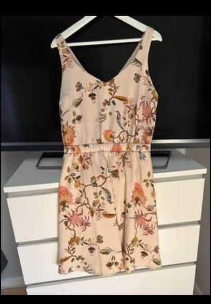 Ärmlös klänning med v-ringning och resår i midjan. Klänningen har ett blommigt mönster.