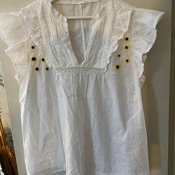 Marinblå klänning med krage, dolda knappar framtill hela vägen ner och ett band i midjan. Klänningen har korta ärmar med upprullad design och två fickor på bröstet. Strl L.