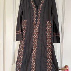 Långärmad klänning med ett blommigt mönster. Klänningen har en knyt detalj vid halsen.