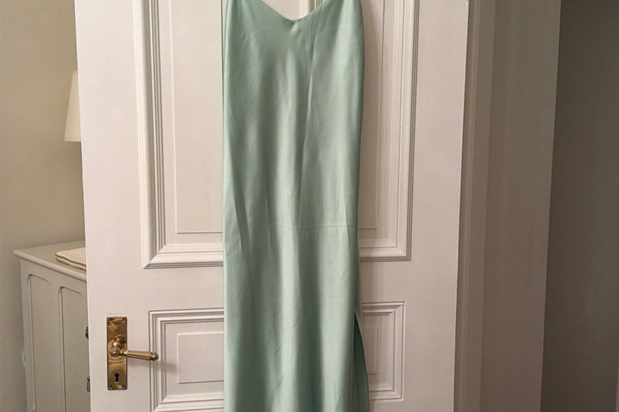 Lång klänning i en ljusgrön nyans med smala axelband och v-ringning. Klänningen har en slits i sidan.