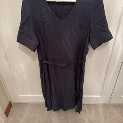 Klänningen har korta ärmar och en rund halsringning. Dold dragkedja på sidan