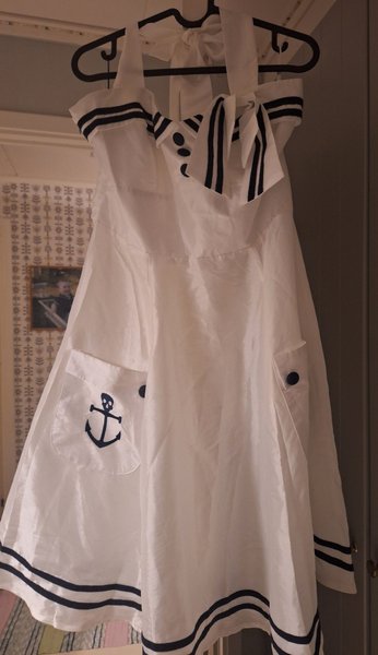Vit klänning med sjömanskrage och svarta ränder. Halterneck. Klänningen har en ankardetalj på fickan och knappar framtill. Passar perfekt för en marininspirerad look.