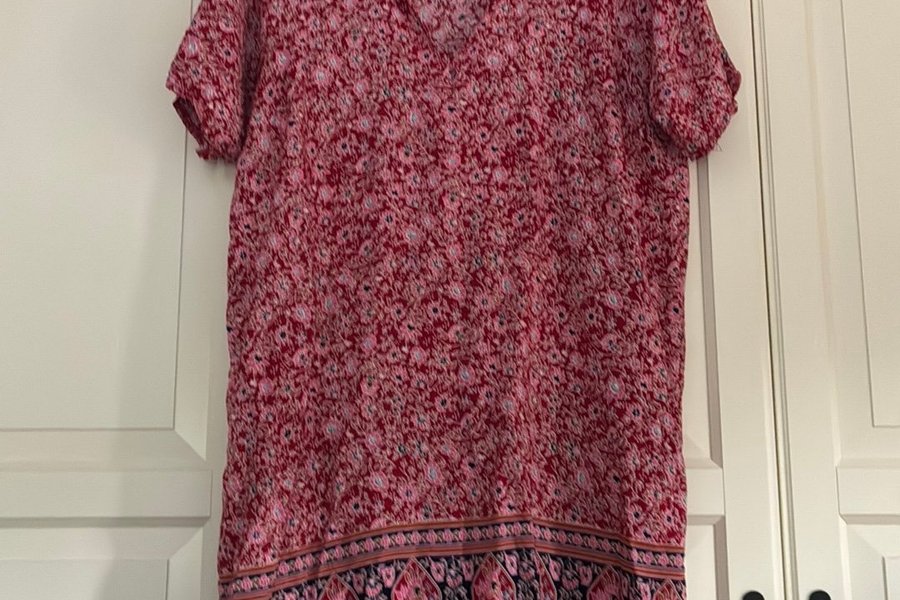 Klänning med ett blommigt mönster i rött och rosa. Den har en v-ringning och korta ärmar. Nedtill finns en dekorativ bård med ett paisley-liknande mönster.