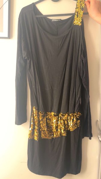 Svart klänning med lång ärm och guldiga paljetter på axeln och runt midjan.