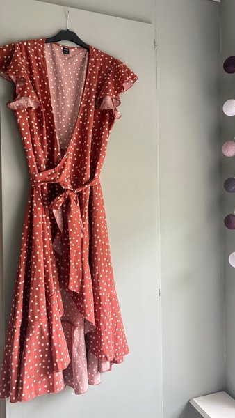 En söt omlottklänning med volangärmar och ett prickigt mönster. Klänningen har ett band i midjan som kan knytas för att framhäva figuren. Den har en asymmetrisk fåll som ger en lekfull touch.