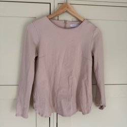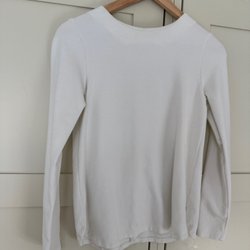 Grå stickad klänning med långa ärmar och en bred krage. Klänningen har en enkel och stilren design.