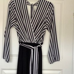 Klänning med en smickrande V-ringning och korta ärmar. Klänningen har en markerad midja och draperade detaljer över kjoldelen, vilket skapar en elegant silhuett. Dragkedja baktill för enkel påklädning.