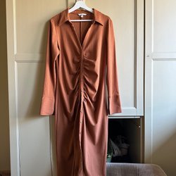 Virkad klänning med V-ringning fram och bak. Den har en figurnära passform och är lite stretchig.