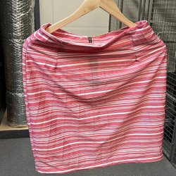 Jag är stl M, men denna är nu i minsta laget för mig. Skulle säga storlek S/36, knähöjd på kjolen / slutar ovanför knä och är luftig i tyget. Väldigt snygg med skärp till, eller som mer dressad. Handsydd.