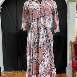 Vintage 70-tal. Klänning med rött blommönster och röda knappar framtill. Klänningen har en V-ringning och två fickor framtill. Klänningen har även röda detaljer längs kanterna och i midjan. Skicket är bra och färgerna starka MEN det finns två färgfläckar, se bilder, som är riktigt tråkiga. Men vill du ha den perfekta städrocken i skön bomull för liten slant så slå till!