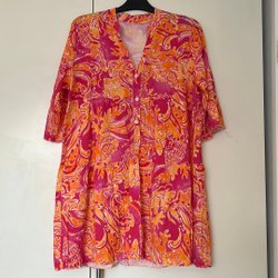 Klänning med ett blommigt mönster i olika färger. Klänningen har korta ärmar och en rund halsringning.