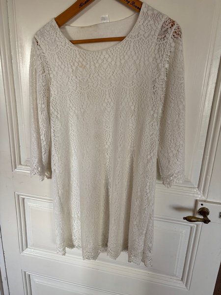 Vit klänning med 3/4 ärmar och spetsdetaljer. Klänningen har en rund halsringning och en lös passform. fodrad använd en .gång