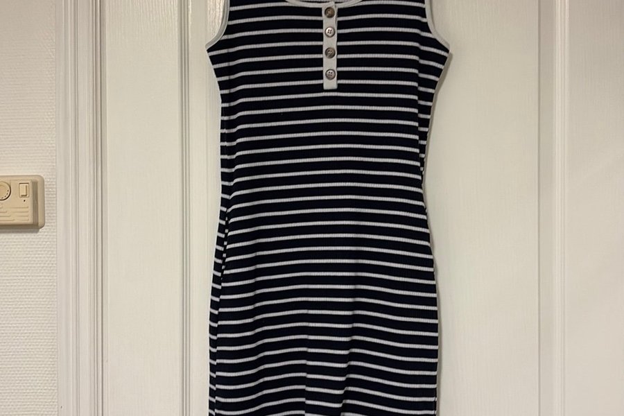 Klänning med rund halsringning och ärmlös design. Klänningen har knappar framtill.
