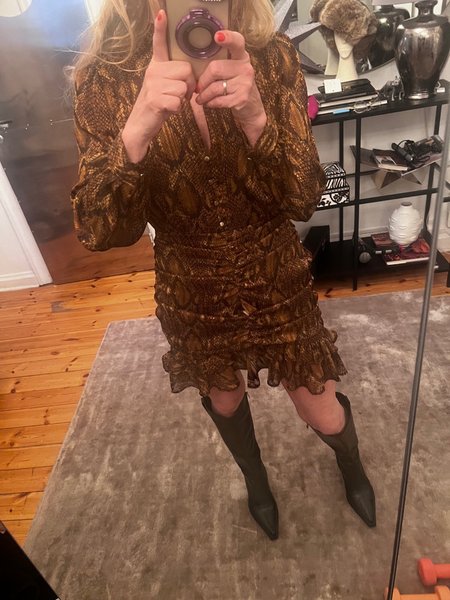 Brun klänning med långa ärmar och ett ormskinnsmönster. Klänningen har en rynkad design i midjan och en volang nedtill.