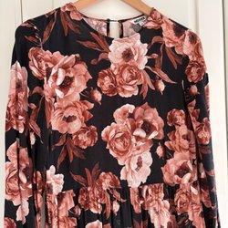 Gul klänning med korta ärmar och ett mönster av vita och gråa blommor. Klänningen har en rund halsringning och en markerad midja med resår. Kjolen är lätt utsvängd.
