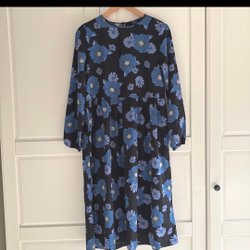 Klänning med korta puffärmar och rund halsringning. Klänningen har en insydd resår i midjan som skapar en smickrande silhuett. Mönstret består av stiliserade blommor i vitt och grått mot en solgul bakgrund.