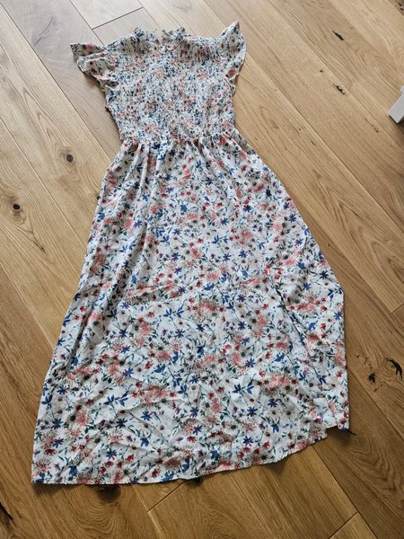 Klänning med smockad överdel och volangärmar. Klänningen har ett blommigt mönster i rosa, blått och rött på en vit botten. Kjoldelen är utsvängd.