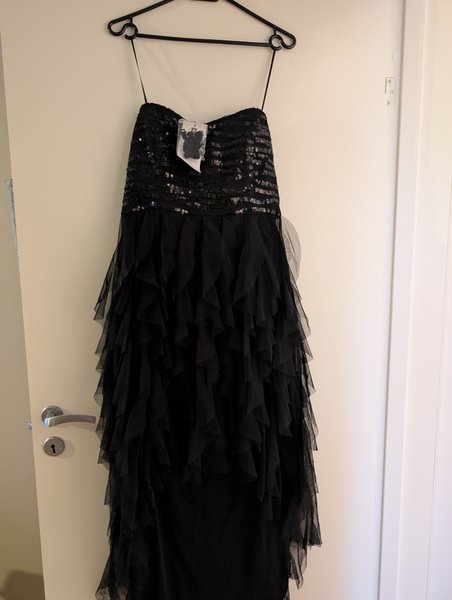Svart, axelbandslös klänning med paljetter upptill och volanger nedtill. Aldrig använd, tagg kvar.