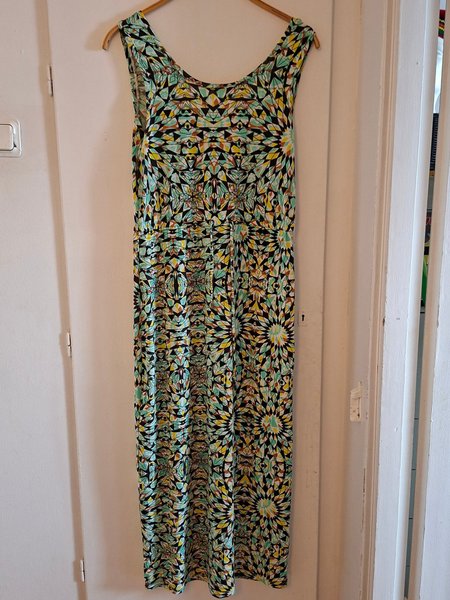 Lång klänning med ett färgglatt mönster i geometriska former. Klänningen har en rundad halsringning och är ärmlös. Midjan är markerad med ett resårband som skapar en smickrande silhuett. Klänningen faller löst från midjan och neråt.