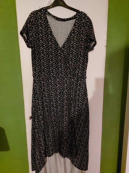 Klänning med kort ärm och V-ringning. Klänningen har ett blommigt mönster över hela tyget och en omlottdesign i midjan. Nederkanten är asymmetrisk, kortare fram och längre bak.