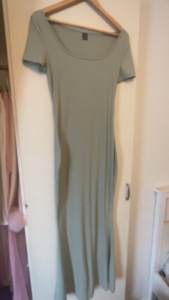 En lång klänning med korta ärmar och rund halsringning. Klänningen har en figurnära passform.