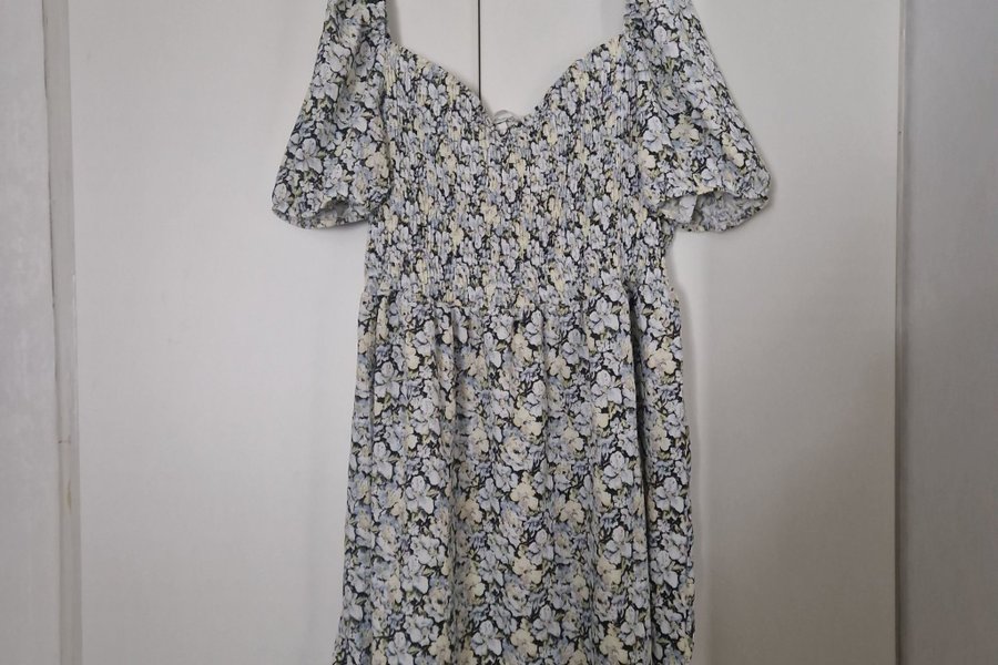 Klänning med blommigt mönster. Klänningen har puffärmar och smockdetaljer i överdelen.