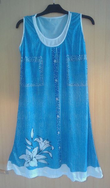 Ärmlös klänning i blått med vita detaljer. Klänningen har ett mönster som liknar denimstruktur och vita detaljer runt halsringningen och nederkanten. På framsidan finns dekorativa fickimitationer och en vertikal rand med knappar. Nedtill på klänningen finns ett stort vitt blommönster.