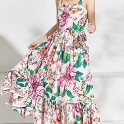 Lyserød kjole med et mønster af hvide og sorte striber. Kjolen har en skjortekrave, korte ærmer og en sort bælte i taljen. Den nederste del af kjolen har en flæsekant.