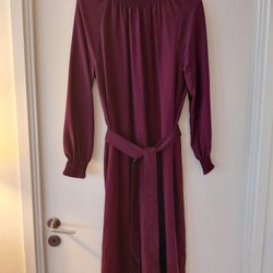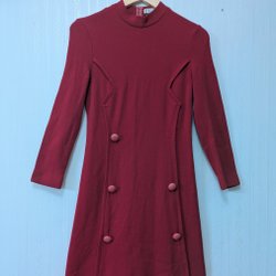 Röd retro klänning med ett intrikat mönster över hela tyget. Klänningen har en krage och en liten rosett framtill på bröstet. Ärmarna är trekvartslånga. På sidan finns en fullt fungerande dragkedja. Storlek small eller liten medium.