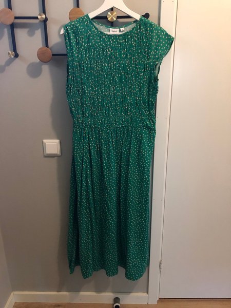 Grön klänning med ett mönster i en ljusare nyans. Klänningen har resår i midjan och en smockad överdel.