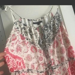Fejk omlottklänning med v-ringning och korta ärmar. Klänningen har ett blommigt mönster i olika färger. Uppskattar till storlek 44.