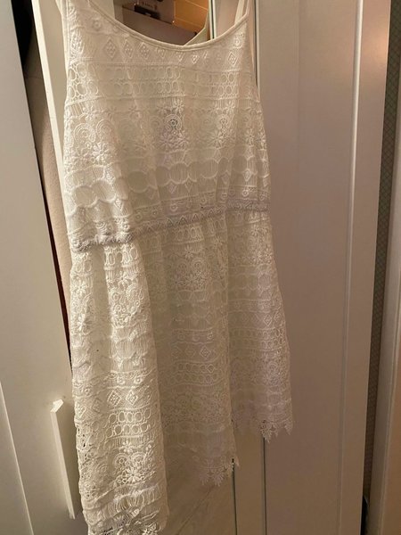 Vit spetsklänning med tunna axelband. Klänningen har en A-linjeform och är gjord av ett fint spetsmaterial. Den har en avslappnad passform och är perfekt för varma sommardagar eller speciella tillfällen. Storlek L.