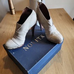 Vit Klänning med plisserad kjol och plisserade detaljer över bysten. Klänningen har knappar baktill på överdelen och resår i midjan. Bild 1 visar färgen bäst. Gammaldags stuk.
