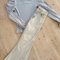 Vit klänning med blad. Kortärmad med v-ringning. Har sprättat upp den i v-ringningen, se bild. Lätt att sy tillbaka om man vill.