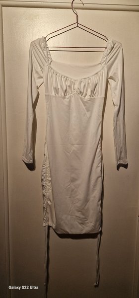 Vit klänning med långa ärmar och rynkad byst. Klänningen har en fyrkantig halsringning och rynkdetaljer längs sidorna som kan justeras med dragskor.
