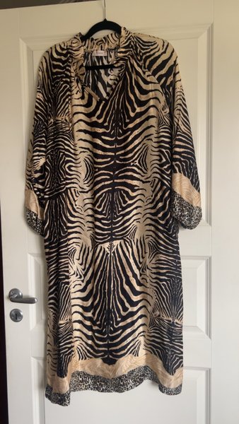 Klänning med zebrarandigt mönster i svart och beige. Klänningen har en V-ringning och trekvartsärmar. Ärmsluten och nederkanten har ett leopardmönstrat band. Märke Gemini