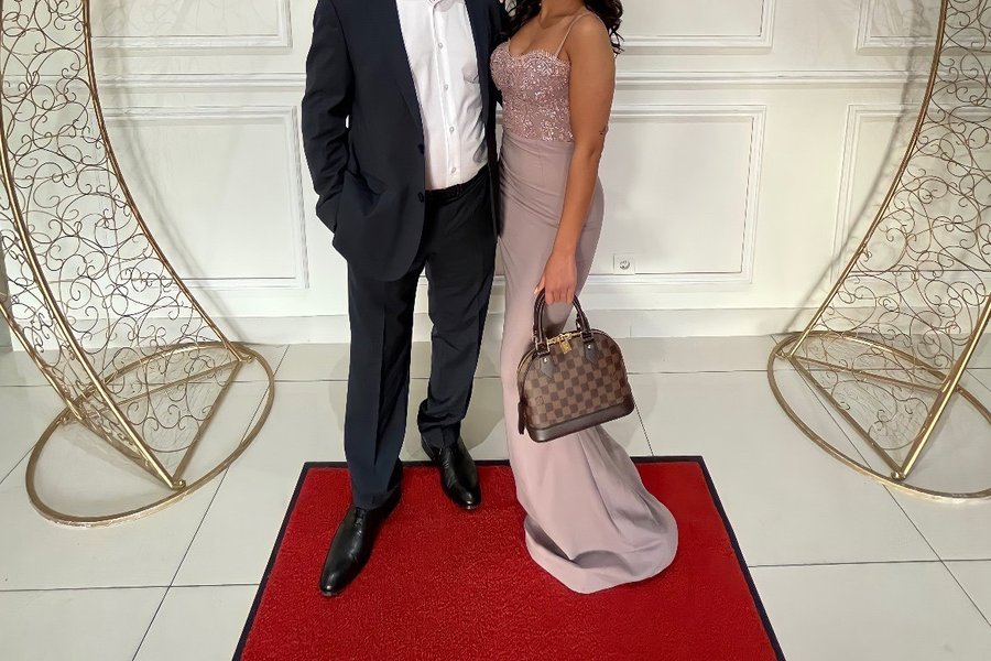 Elegant långklänning med detaljerad överdel och smala axelband. Klänningen har en figurnära passform och en subtil släpe.