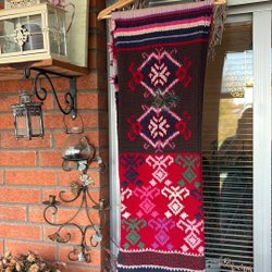 Långärmad klänning med V-ringning och ett intrikat mönster i lila nyanser. Klänningen har en rak passform och muddar vid ärmsluten.hel ny med tags kvar st XL material Ull 57% 32% viscose 9% metal 3%polyester