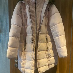Långärmad klänning i rosa och vitt mönster med v-hals och volang nedtill. Väldigt rymlig XL, helt ny, då den blev alldeles för stor för mig. Bystmått mätt rakt över under ärm, 60cm