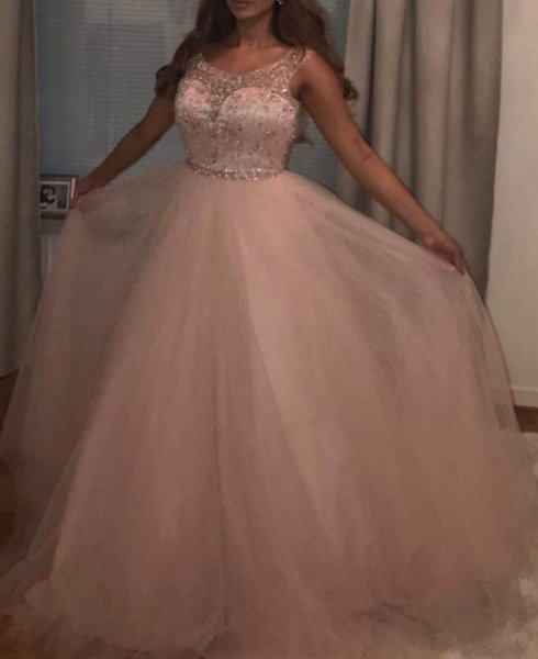 Lång, rosa balklänning med strassdetaljer på överdelen och midjan. Klänningen har en vacker, utställd kjol.
