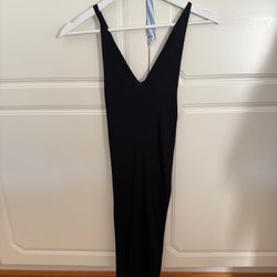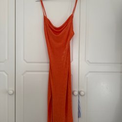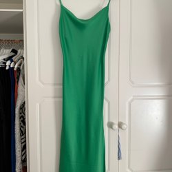 Lång, guld-färgad klänning med smala axelband och v-ringning. Klänningen har en åtsittande passform.
