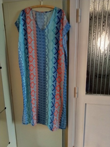 Lång kaftan med ett livfullt mönster i blåa, turkosa och korallfärgade nyanser. Kaftanen har en V-ringning och korta ärmar, vilket ger en avslappnad passform. Mönstret består av ränder med geometriska former som rutor och halvcirklar, vilket skapar en dynamisk och iögonfallande design. Kaftanen är perfekt för en bekväm och stilfull look.
