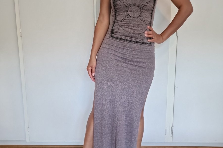 Ärmlös, gråmelerad maxiklänning med tryck framtill. Klänningen har en slits på båda sidorna